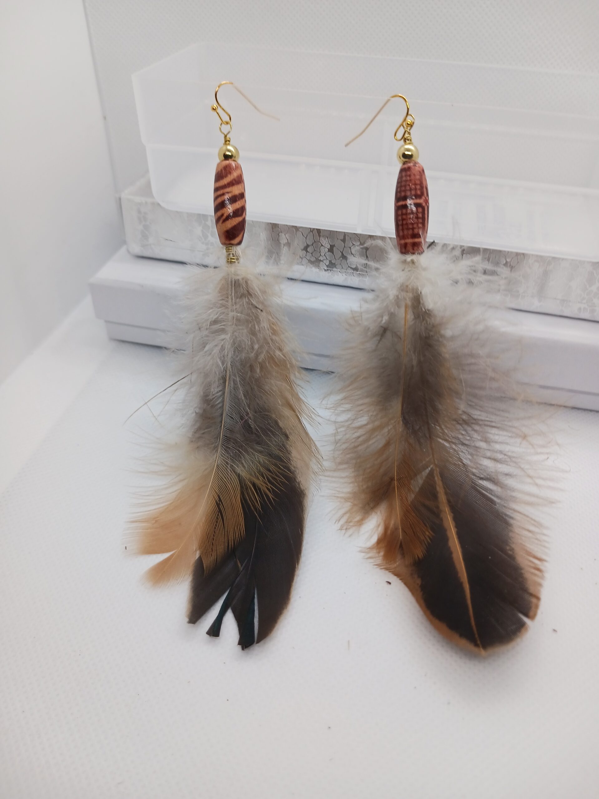 At the core of these earrings are authentic African wood beads, known for their durability and rich textures. The gray feathers are lightweight, adding a touch of sophistication without compromising comfort. Carefully selected materials ensure that these earrings not only look stunning but are also built to withstand daily wear without losing their charm.